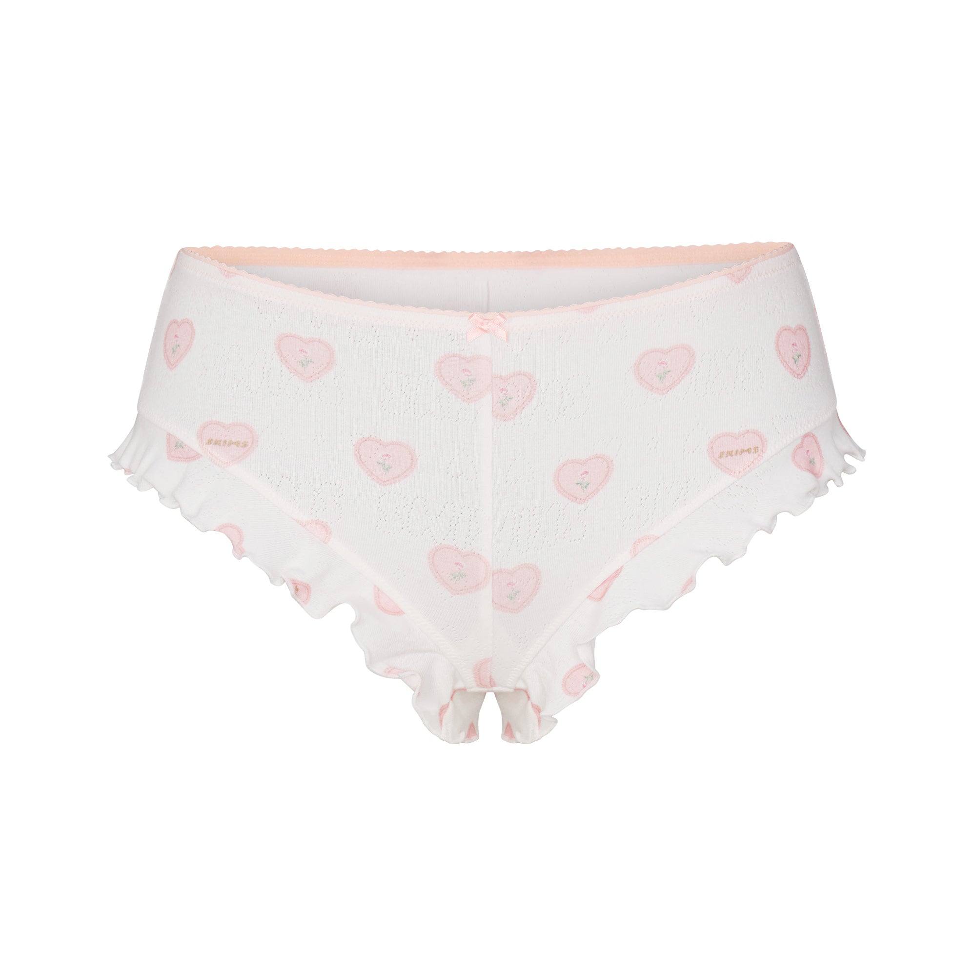 A matching set you’ll adore. Designed in our lightweight pointelle, this set includes a cropped scoop neck cami with adjustable straps, lettuce edge hem, and a satin bow detail. The short includes a picot elastic waistband, ruffle leg opening, satin bow detail, and 100% cotton gusset.