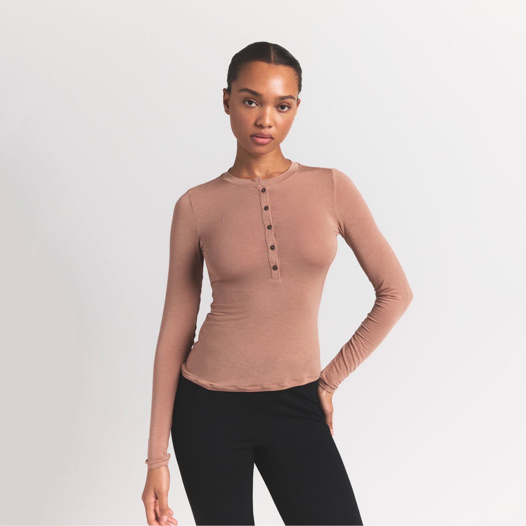 Your most elevated staple. This sheer crewneck henley is made from our super soft modal-cashmere blend and features an ultra-flattering fit.