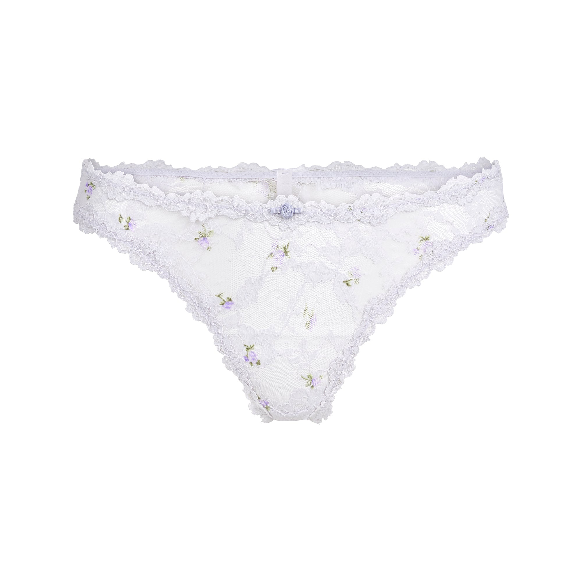 This sexy and feminine sheer lace-adorned dipped front thong is the next addition to your top drawer. Features a rosette detail at the center front, a thong back with minimum coverage, and a cotton gusset. Fits true to size.