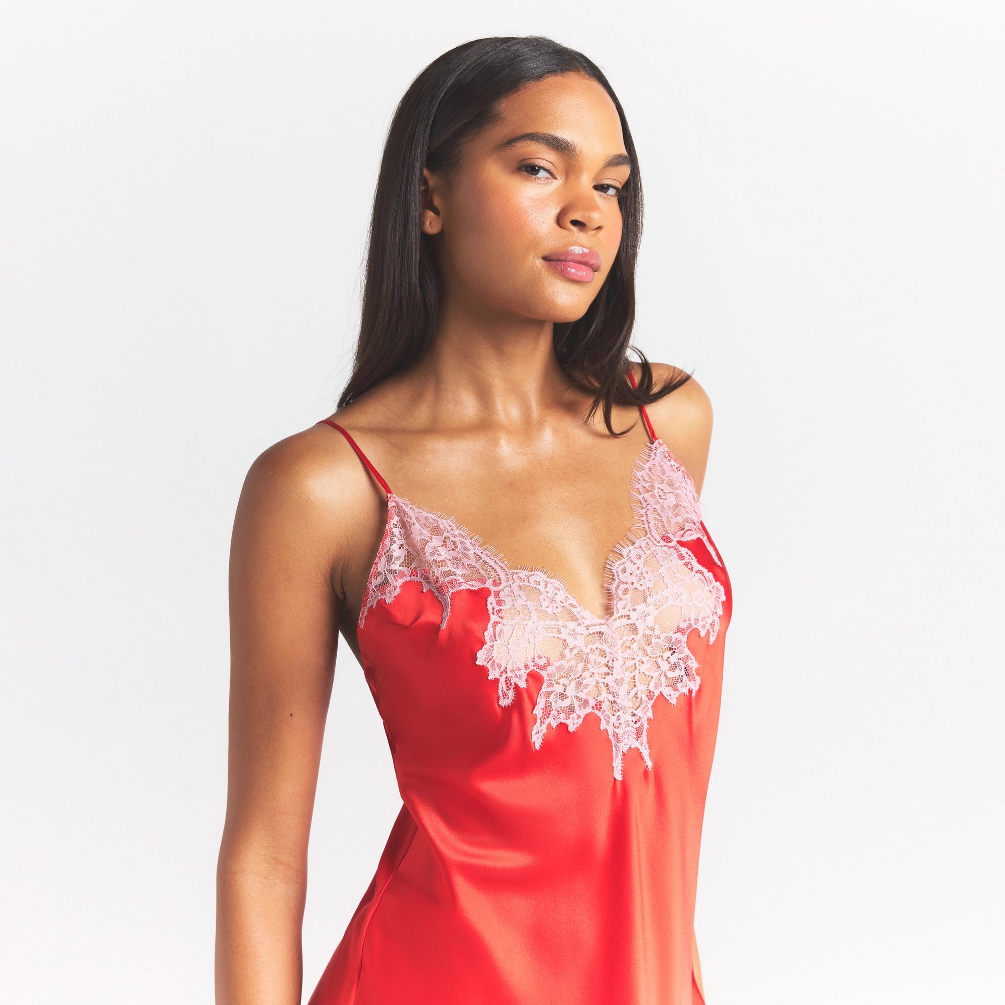 Slip into something sultry. Crafted with contrasting lace details, this luxe mini dress features a triangle neckline and a low scoop-back for a seductive statement.