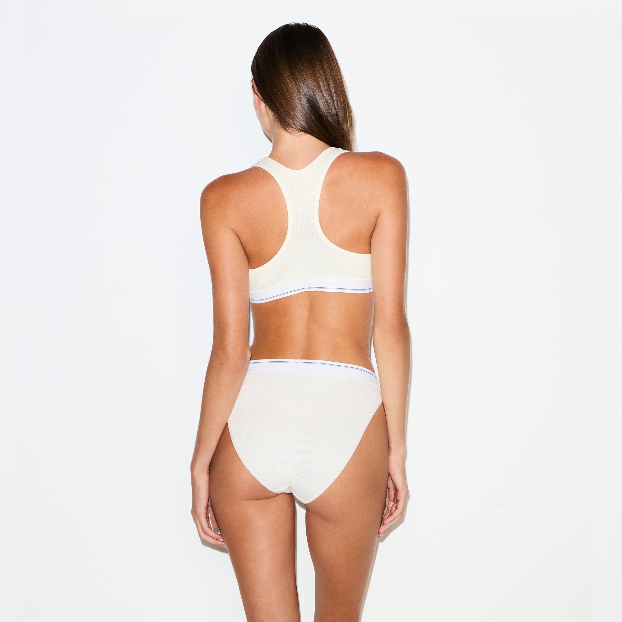 Comfort is cuter in this bralette. This racerback pullover has sporty contrast details and a sexy split neck. Made from our stretchy, breathable Cotton Rib. Features a smooth elastic underband with a repeating, tonal SKIMS logo. Fits true to size.